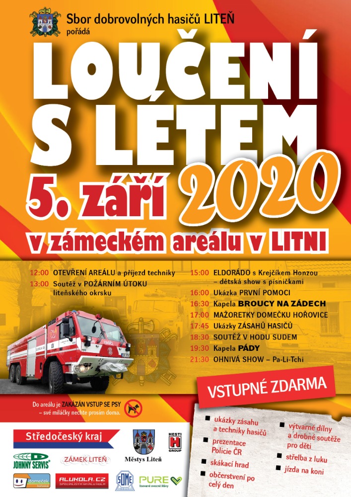 Sbor dobrovolných hasičů Liteň pořádá Loučení s létem dne 5.září 2020 od 13:00 hod. v zámeckém areálu v Litni. Vstupné zdarma.